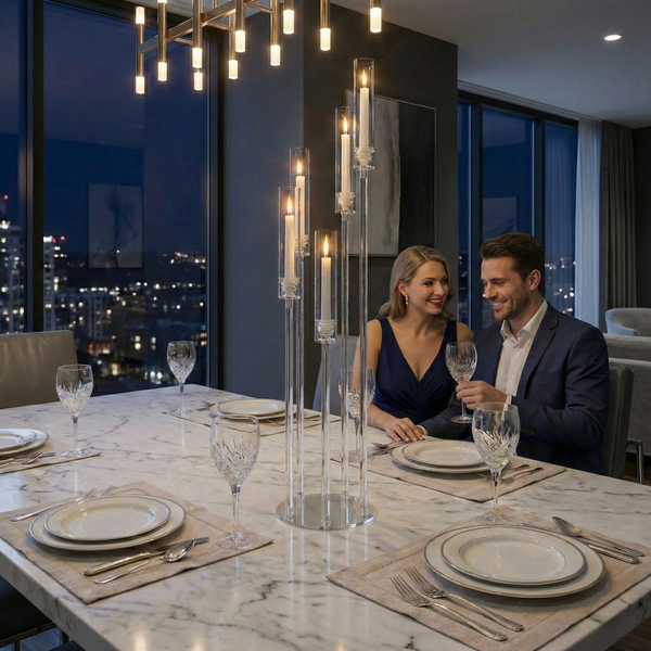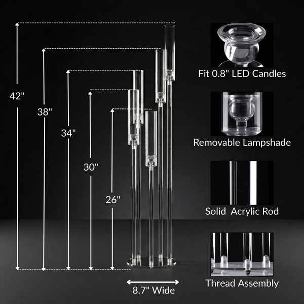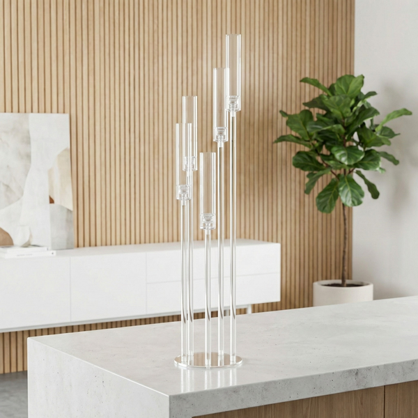 Five-Light Brilliance: Features five elevated arms designed to hold standard taper candles or LED alternatives. The clear acrylic tubes beautifully catch and refract light to create a warm, inviting glow.