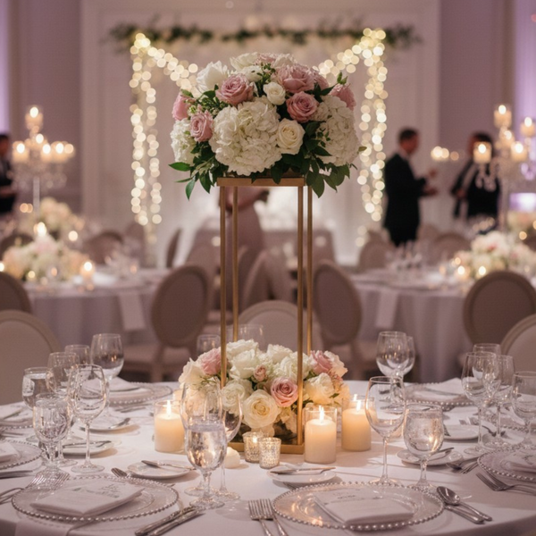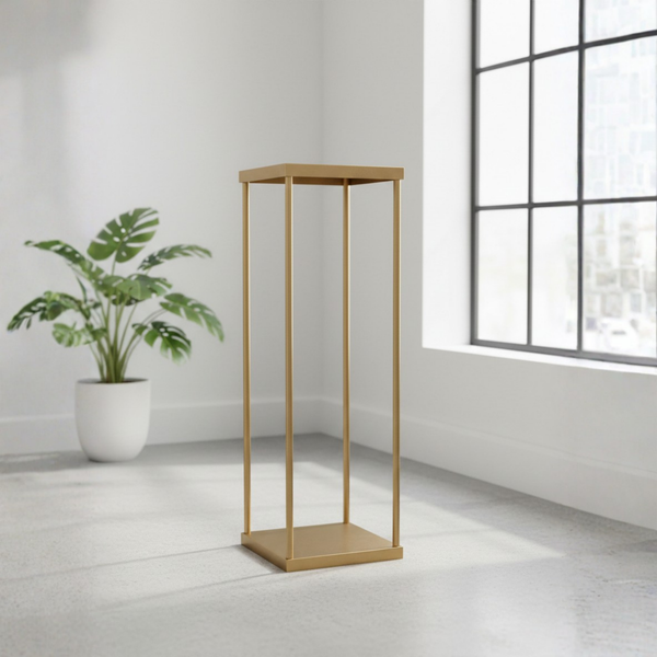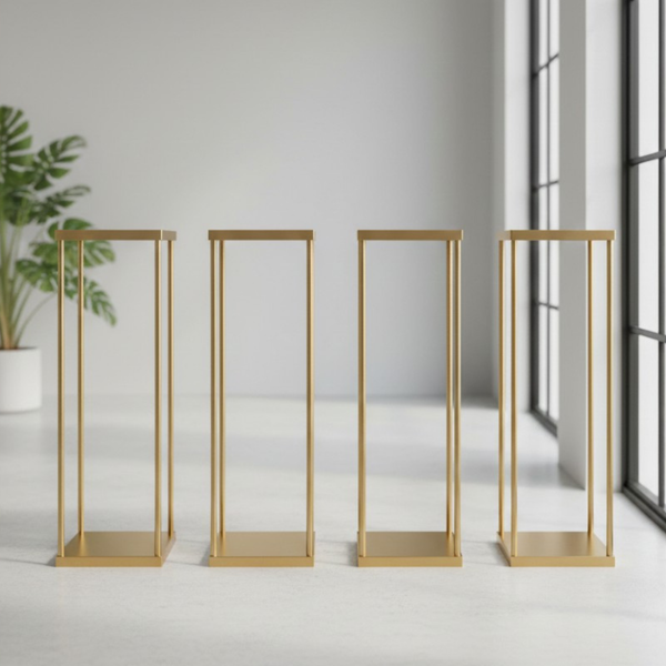 With a sleek, minimalist rectangular silhouette and an elegant Champagne Gold finish, these geometric columns add a high-end, contemporary aesthetic to any venue. The top-shelf design serves as a built-in plate, making it effortless to secure floral foam, lush bouquets, or trailing greenery. Whether you're creating a dramatic "floral bridge" across a long banquet table or a striking focal point for guest rounds, these heavy-duty stands deliver unparalleled stability and style.